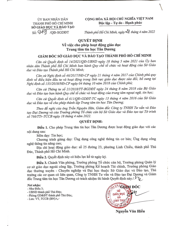 Trung Tâm Tin Học Tân Dương được cấp phép hoạt động số 611/QD-GDDT-TC ngày 13/4/2016, Ông Nguyễn Quốc Sơn là Giám đốc Trung theo theo QĐ số 922/QĐ-SGDDT.